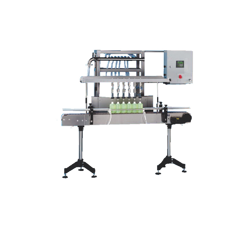 Llenadora lineal de 2, 4, 6 o mas válvulas de llenado por gravedad, o volumétrico, levantamiento neumático de las válvulas regulables en altura. Electroválvula de entrada líquido en acero inoxidable controlada por sondas de nivel o sistema mecanizado.